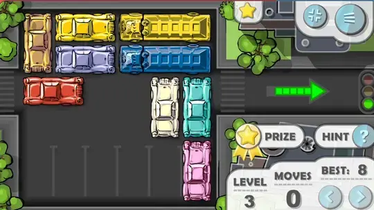 Left click and drag to move cars out of the way to clear a path for the red car to drive to the exit. Cars can move forwards and reverse but can't turn or move to their sides.