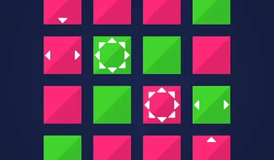 Click on a tile to change its color. Your goal is to make all tiles the same color. Some tiles have arrows on them. Clicking them changes the colors of the tiles they are pointing to. Use the least moves possible to earn three stars!