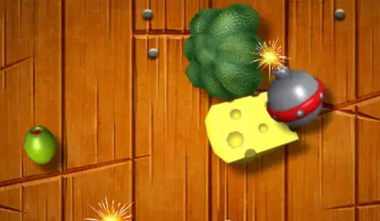 Ziehen Sie die Maus, um das Essen in Scheiben zu schneiden. Holen Sie sich drei oder mehr in einem Stück für einen Combo-Bonus! Achten Sie darauf, den Bomben auszuweichen und lassen Sie kein Essen auf den Boden fallen!